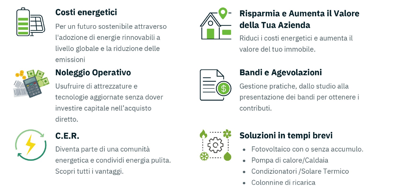 Ci differenziamo dalla concorrenza per la nostra attenzione al cliente e per la nostra dedizione alla qualità. Ci assicuriamo che ogni cliente abbia una soluzione personalizzata e adatta alle proprie esigenze energetiche. Inoltre, ci assicuriamo che tutti i nostri prodotti siano testati e certificati per la massima efficienza e sicurezza.